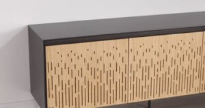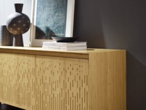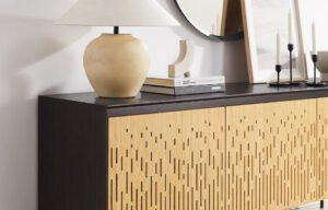 Minimalism with a Dramatic Edge. The Hanna Console makes a bold and beautiful statement with its sculptural waterfall silhouette, elevated by Greenington’s commitment to sustainable craftsmanship. Artfully crafted in solid bamboo, Hanna’s rich hand-applied Caviar finish shimmers with depth and elegance, while its laser-cut Wheat-toned doors add a striking visual contrast—balancing minimalist refinement with standout style.
