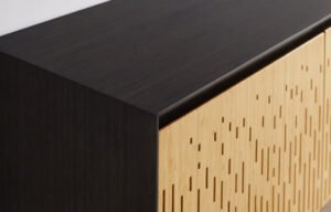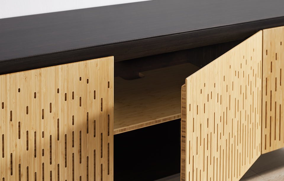 The Caviar finish is a transparent stain that enhances the bamboo’s natural grain, delivering a silky, high-end look. The contrasting Wheat doors result from an innovative caramelization process using only heat, steam, and pressure—no dyes or stains—creating a warm, organic tone with unique striping that flows through the material. Each piece is one of a kind, showcasing the authentic grain variation and quality that only real bamboo can offer.