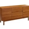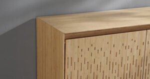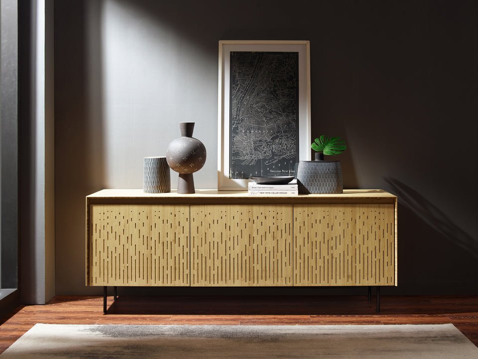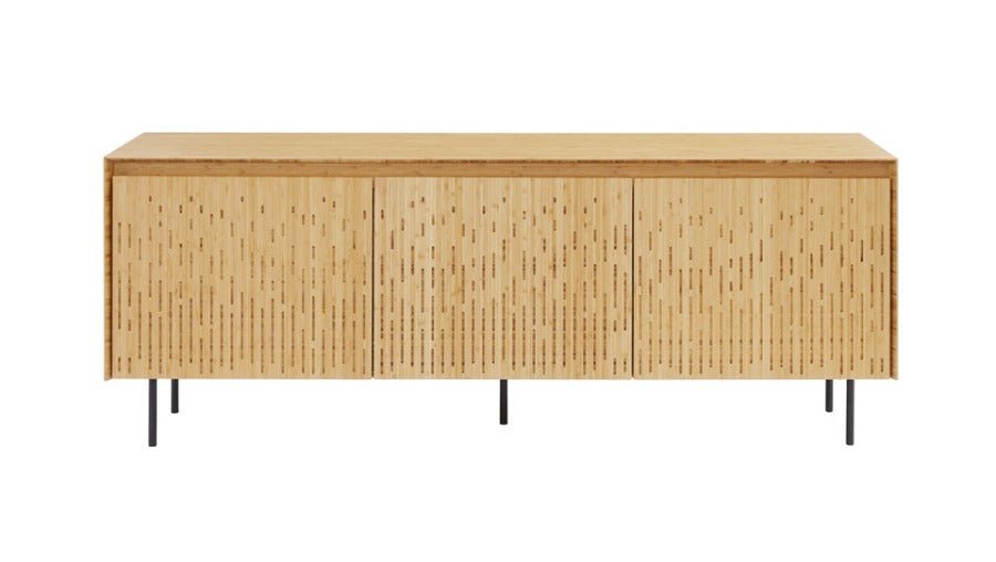 Innovative laser door detailing within the bamboo grain strikes an elegant balance between minimalist styling and a casual, inviting feel. No detail is too small; design elements include a slim black steel base, a beautifully finished back, soft-close doors, magnetic closures, recessed pulls, and cord management. Beautiful and unique for the modern home, Hanna functions beautifully as a sideboard, credenza, media console, or room divider, easily organizing your essentials with style.
