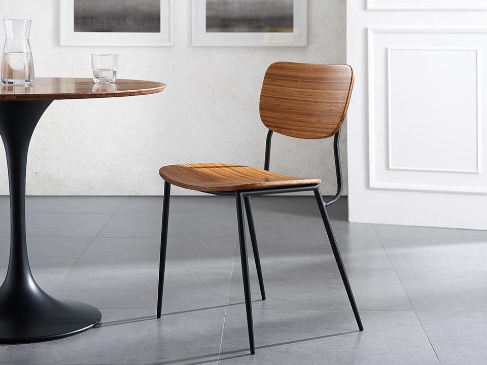 Lightweight and surprisingly strong, the charming Soho dining chair celebrates the beauty of solid Amber bamboo. Perfect for casual dining, the gently curved solid bamboo seat and back offers just right comfort, and beautifully contrasts with the graceful matte black steel frame. Each leg tipped at the base with black