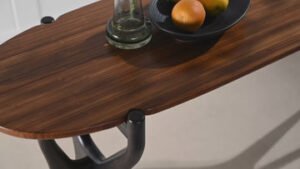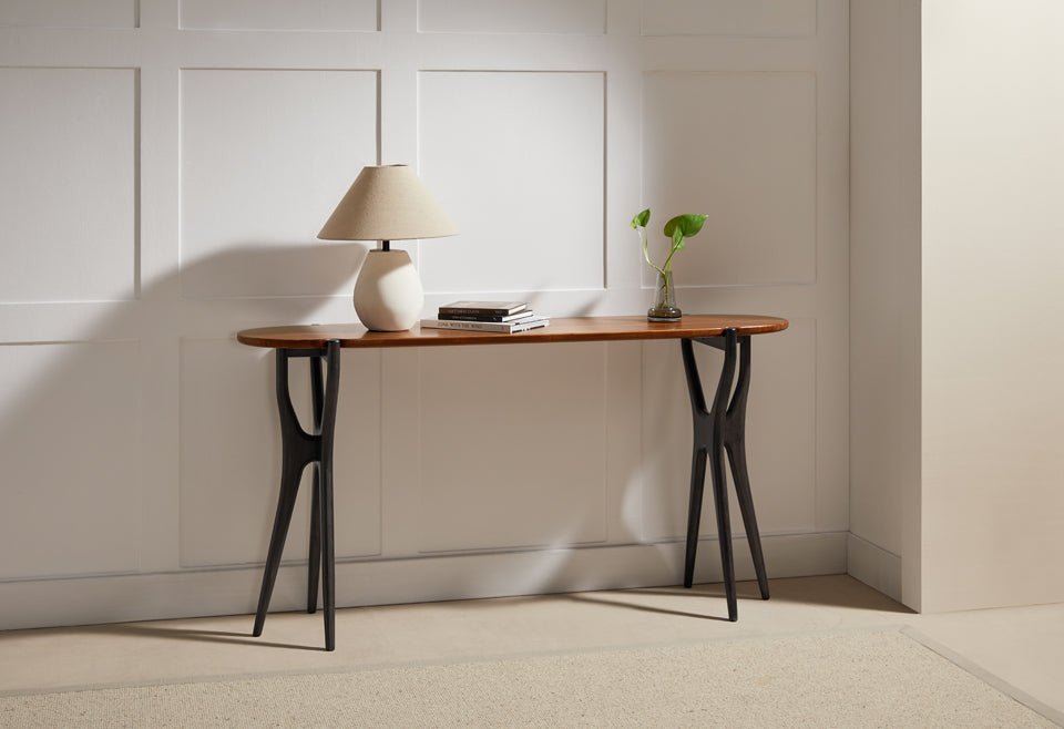 Winner of the 2024 Pinnacle Greenleaf Award, the Tofino console table stands out with its distinctive design inspired by the beauty of nature. Its freeform base, reminiscent of intertwining vines or tree roots, features elegantly inset legs hand finished in Caviar stain and supporting an oblong Amber tabletop. The Tofi